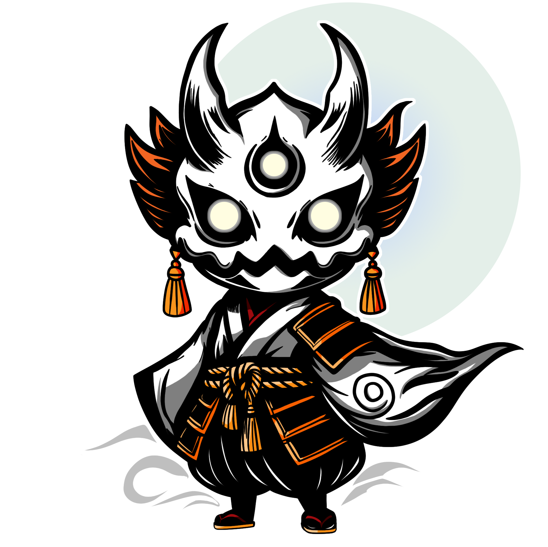 This striking design features a mysterious spirit clad in traditional armor and robes, with burning eyes and a demonic horned face. A fusion of Japanese folklore and modern fantasy art, this ghostly warrior drips with power, mystery, and style.